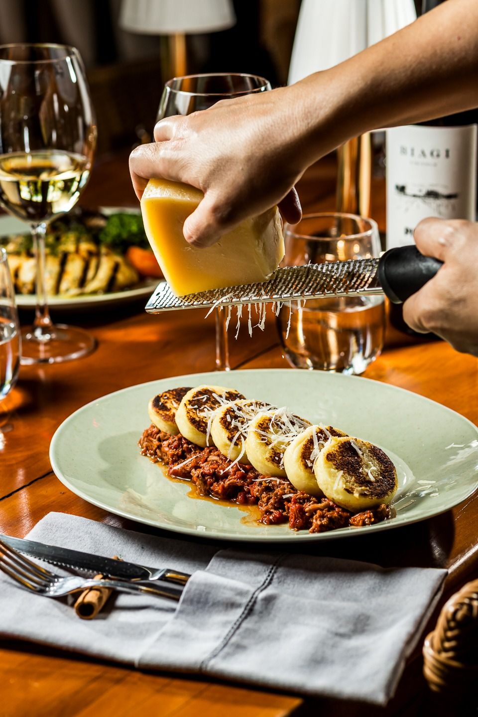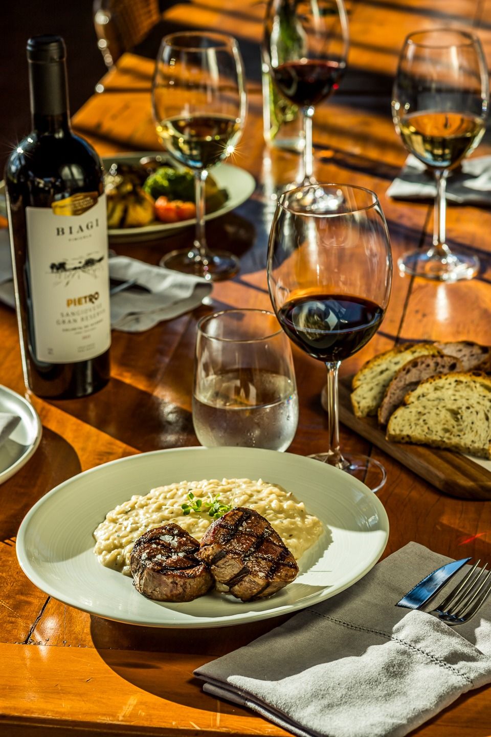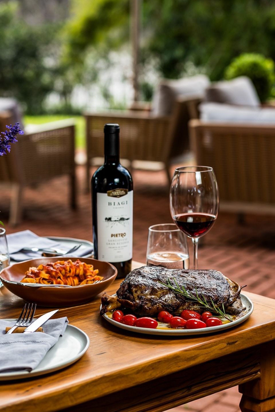 A nossa Osteria está localizada em meio aos nossos vinhedos. É ali que todos podem desacelerar, com as vistas para nossas colinas, lagos e jardins, provando nossos pratos junto dos vinhos que produzimos.